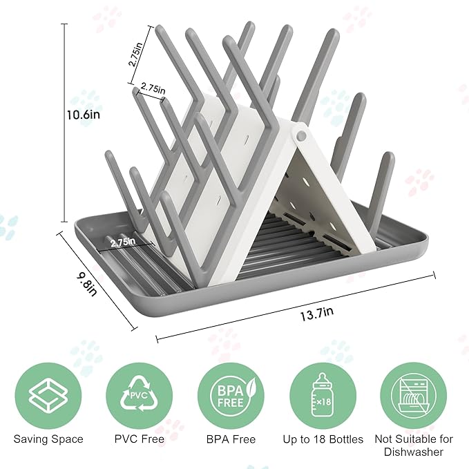 - Thoughtful Design: Our baby bottle drying rack features double slope standboard with a triangular structure, which minimizes tipping as much as possible when fully loaded. Ventilated backboard and branch design promots airflow to dry baby bottles and pacifiers. The drip tray can catch drips, and quickly dry with kitchen paper, keeping your countertop neat and dry
