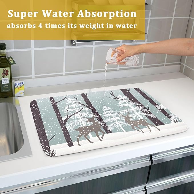 - 1【Good Material】:Our winter wildlife deer drying mat is made of high absorbent microfiber and the middle is made of composite spongedurable, reversible do not fade and comfortable. At the same time, it can protect your kitchen counter from scratching by the tableware.