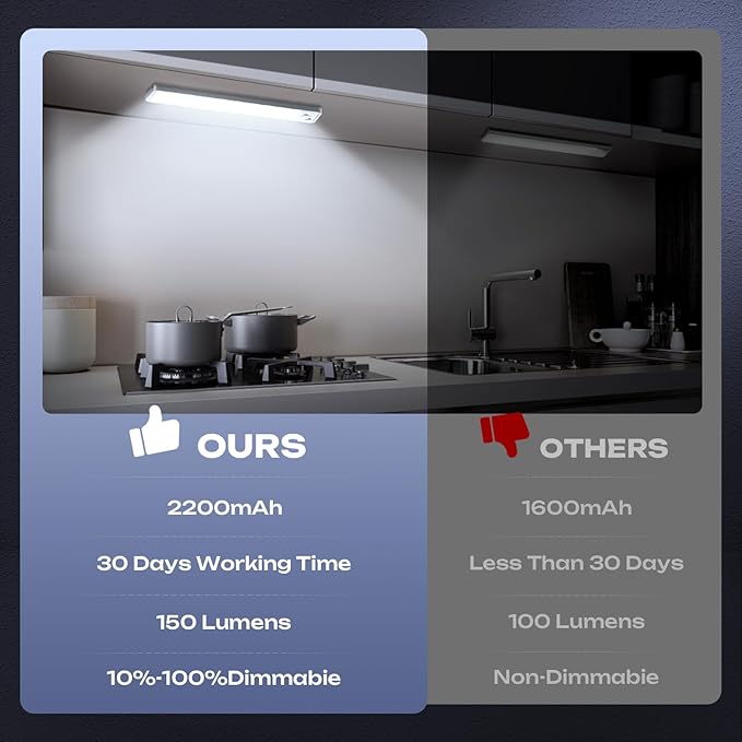 - 【Super Large Battery Capacity】: Our under cabinet light is equipped with a powerful 2200mAh rechargeable battery,It can work continuously for 8 hours. With USB-C fast charging