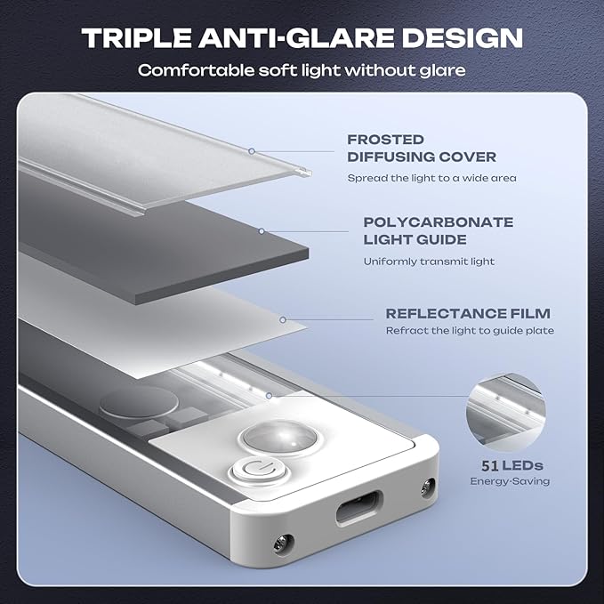 - 【Multiple Working Modes】: LED under-cabinet lighting offers two modes: Auto Mode and Always-On Mode. In Auto Mode, the advanced motion sensor detects movement and activates the light in dark environments, ideal for safe, hands-free illumination. Always-On Mode provides continuous light, perfect for cooking, reading, or other tasks