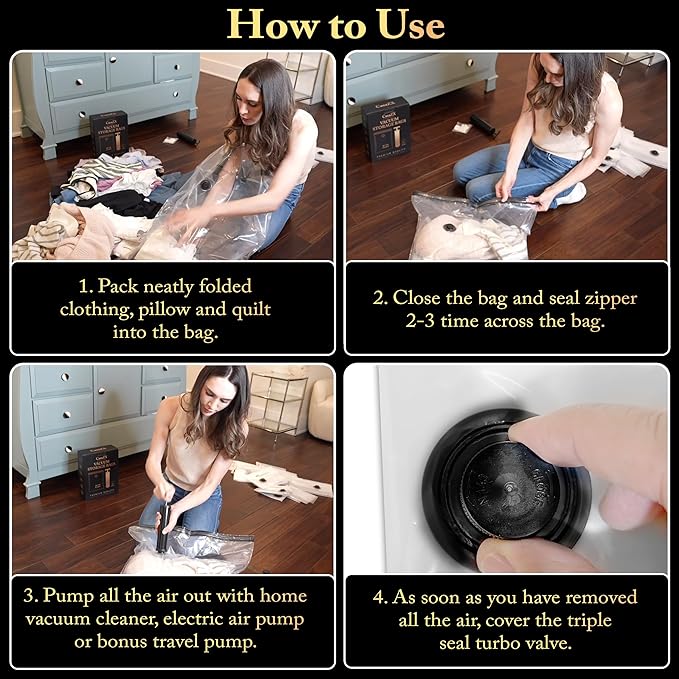 - EASY TO USE — No pump or vacuum needed. Simply roll or press to remove air — perfect for travel, small apartments, RVs, or quick organization.