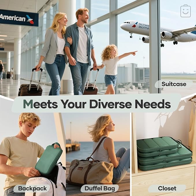 - All-in-One Organization for Your Travel Needs - This 9-piece set includes four compression cubes (S/M/L/XL) for systematic packing: S for underwear/socks, M for T-shirts and shirts, L for jeans and light sweaters, and XL for coats or bulky items. Also features two PVC toiletry/makeup bags, a machine-washable laundry bag, a shoe bag, and a multi-purpose zippered pouch—keeping your luggage tidy and efficient.