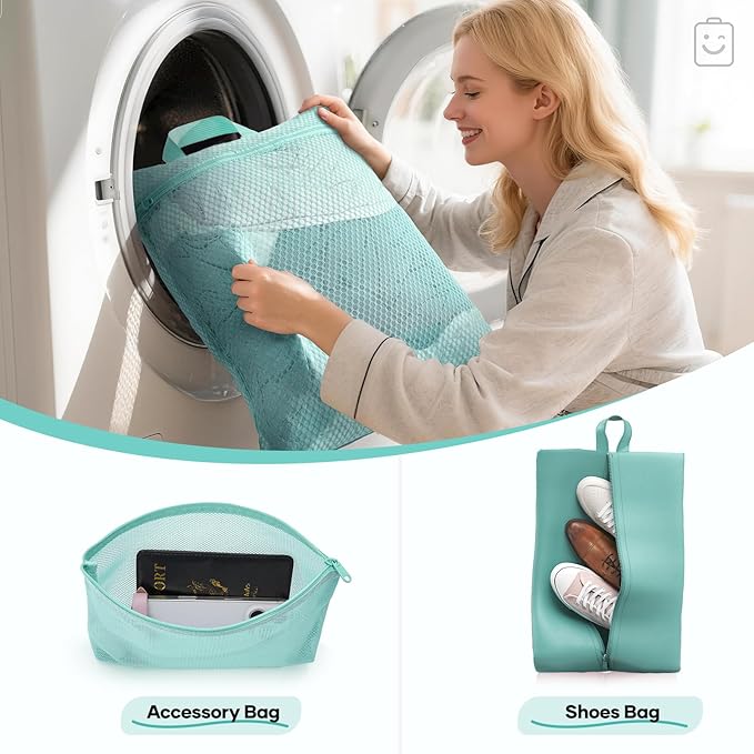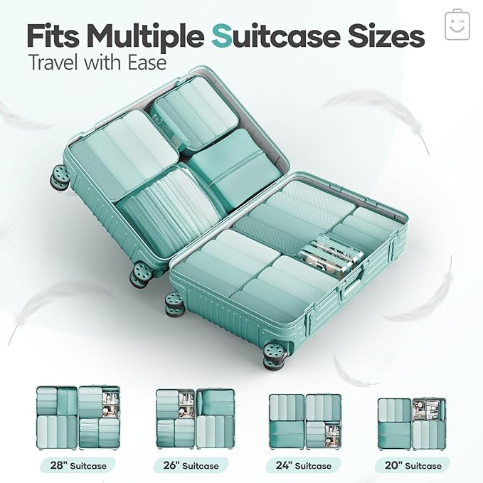 - All-in-One Organization for Your Travel Needs - This 11-piece set includes six compression cubes (S/M*2/L*2/XL) for systematic packing: S for underwear/socks, M for T-shirts and shirts, L for jeans and light sweaters, and XL for coats or bulky items. Also features two PVC toiletry/makeup bags, a machine-washable laundry bag, a shoe bag, and a multi-purpose zippered pouch—keeping your luggage tidy and efficient.