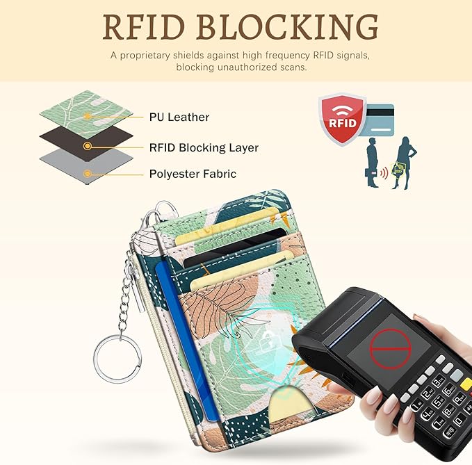 - RFID Blocking: This slim wallet for women blocks electronic theft with advanced RFID blocking technology, keeping your cards and information secure. Made from PU leather, this keychain wallet features a smooth-gliding zipper and reinforced stitching for enhanced durability