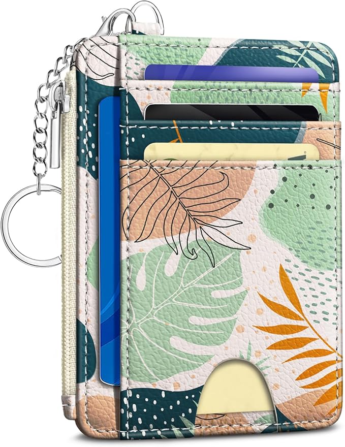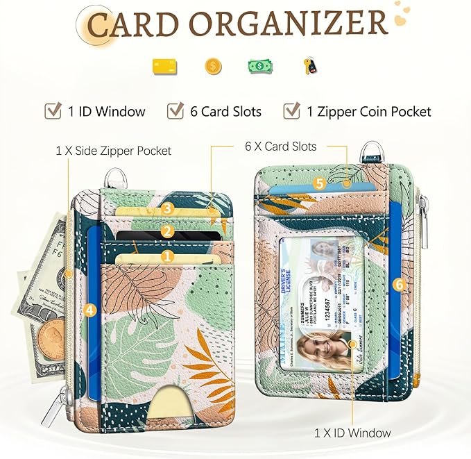 - Functional Design: This card holder wallet features a zippered coin pocket for secure change storage, a clear ID window for quick identification, and 6 card slots for credit cards. The special thumb slot design lets you take out card easily and effortlessly. The credit card wallet comes with keychain to keep your keys secure, along with a D-loop for attaching your own lanyard or wristlet, keeping your travel wallet attainable at all times