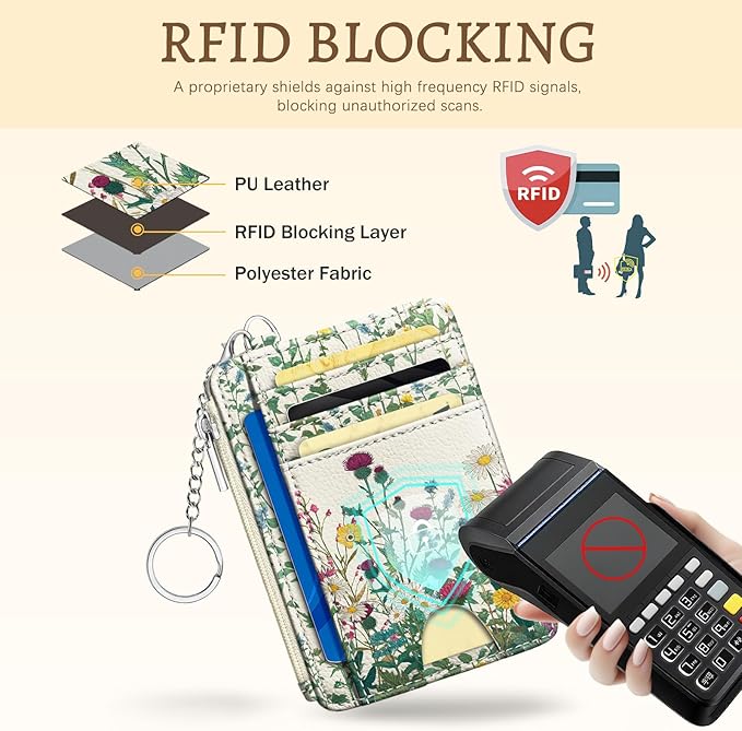 - RFID Blocking: This slim wallet for women blocks electronic theft with advanced RFID blocking technology, keeping your cards and information secure. Made from PU leather, this keychain wallet features a smooth-gliding zipper and reinforced stitching for enhanced durability