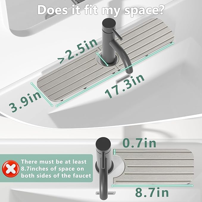 - 1.【Size Guide】: Measure your sink first. Ensure faucet and sink have no obstructions. Splash guard size: 17.3"L x 4"W. Center hole: 2.5" diameter.