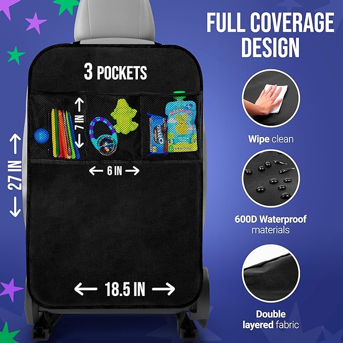 - Full Coverage Design - Sized at 19" x 27", these car backseat organizers offer generous storage. Ideal as a car seat organizer backseat or back seat cover for kids to hold gear, snacks, or tablets.