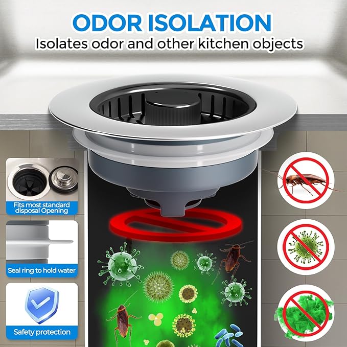 - 【Upgraded 3 in 1 Kitchen Sink Drain Strainer】Our kitchen sink strainer, combines sink drain strainer, kitchen sink stopper and odor isolation together. Press down the pop up button to store water for washing, press again to drain water while catching food waste or scrap from going down the drain. A reliable anti clogging helper and a must have kitchen sink installation parts