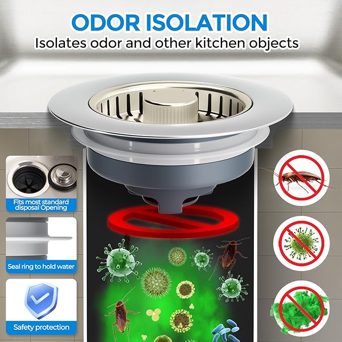 - 【Upgraded 3 in 1 Kitchen Sink Drain Strainer】Our kitchen sink strainer, combines sink drain strainer, kitchen sink stopper and odor isolation together. Press down the pop up button to store water for washing, press again to drain water while catching food waste or scrap from going down the drain. A reliable anti clogging helper and a must have kitchen sink installation parts