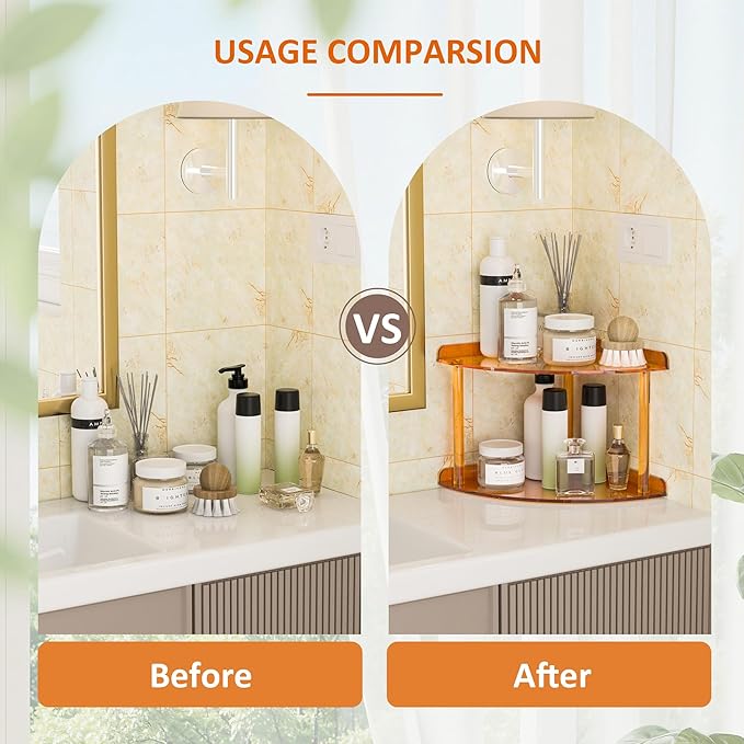 - Space Saver: The countertop organzier corner shelf rack is a perfect space saver in your house. 2 tier design will help you to organize your toiletries, cosmetics, skincare, perfume or spice jars very well. You will get a very tidy counter. Say goodbye to mess!