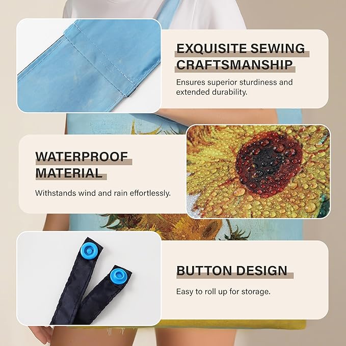 - Features: These eco-friendly totes feature designs inspired by famous paintings: The Starry Night and Sunflowers, Water Lilies, and Woman with a Hat and View from the Window—all printed using non-toxic printing techniques for long-lasting colors