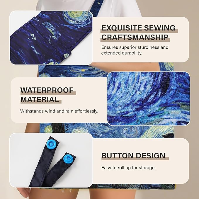 - Features: These eco-friendly totes feature designs inspired by famous paintings: The Starry Night and Sunflowers, Water Lilies, and Woman with a Hat and View from the Window—all printed using non-toxic printing techniques for long-lasting colors