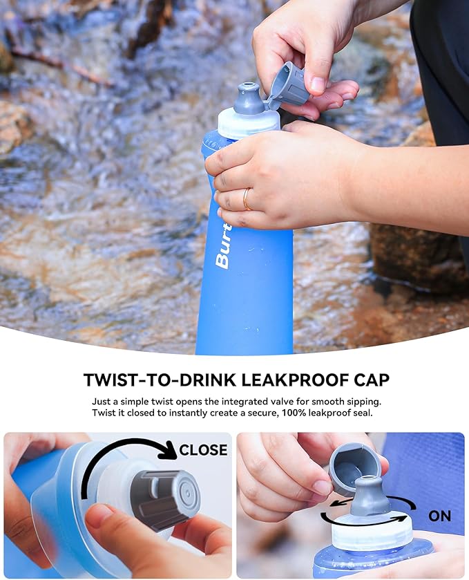- Compatible with 42mm Filter Cartridges: Transform this squeeze water bottle into a personal filtration system. The standard thread seamlessly connects to most popular 42mm water filter cartridges (sold separately), allowing you to safely drink directly from lakes, streams, and other natural water sources. Ideal for Hiking, Camping, Endurance Sports, Travel.