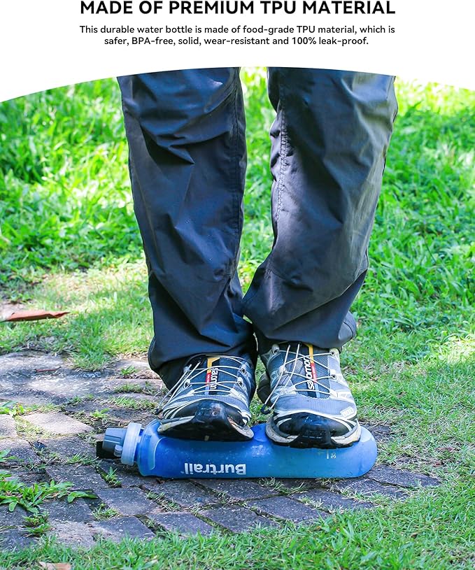 - BPA-Free & Durable: This foldable water bottle is made from food-grade TPU and robust materials, leak-proof and withstands rugged outdoor use. The material is also highly durable and resistant to tears.