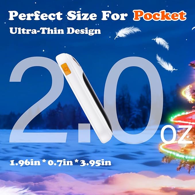 - 【Ultra-Nano Size & Lightweight & Portable】Our electric hand warmers recahrgeaable is only 0.7 inches thick and 2 oz weight, smaller than ID card and 65% lighter than smart phone, making the portable hand warmer be easier to slips easily into jeans, hats, gloves, socks, or a small pocket. They're portable enough for daily commutes or on-the-go adventures, whether you're rushing to the subway or heading out for a weekend hike, the ultra-slim and ergonomic pocket hand warmers are suitable for you