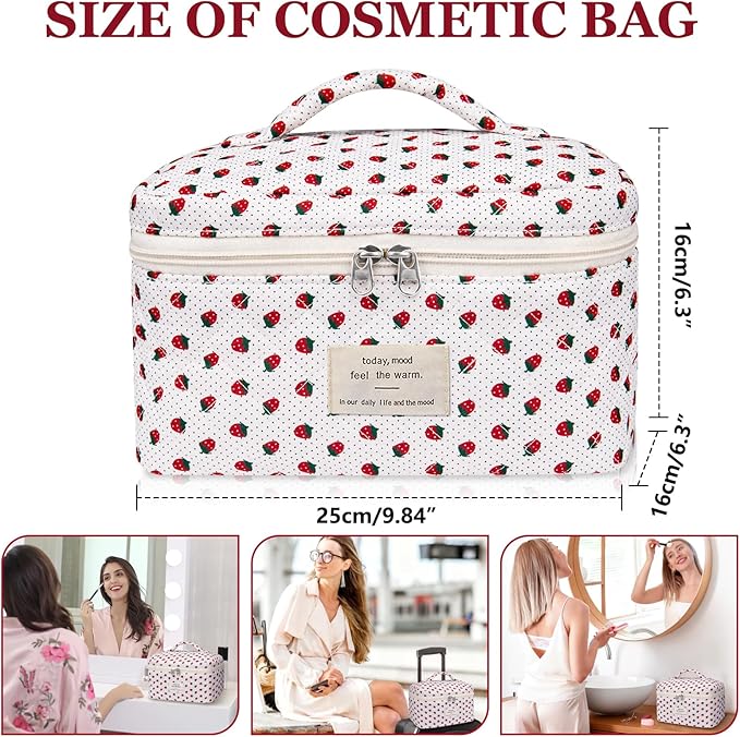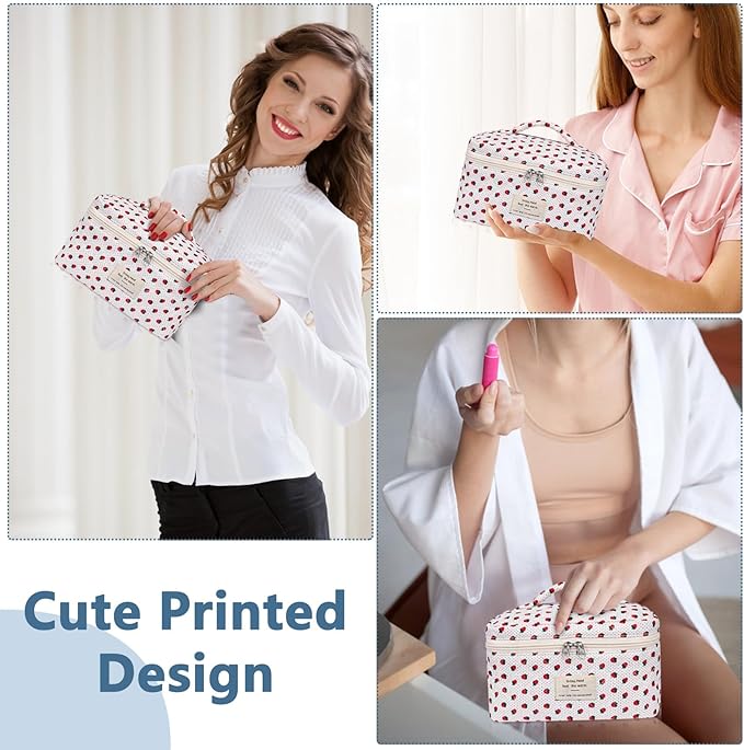 Large Makeup Bag, Cute Cosmetic Bag for Women Girls, Floral Coquette Aesthetic Toiletry Bag, Travel Make Up Organizer Bag (Strawberry)