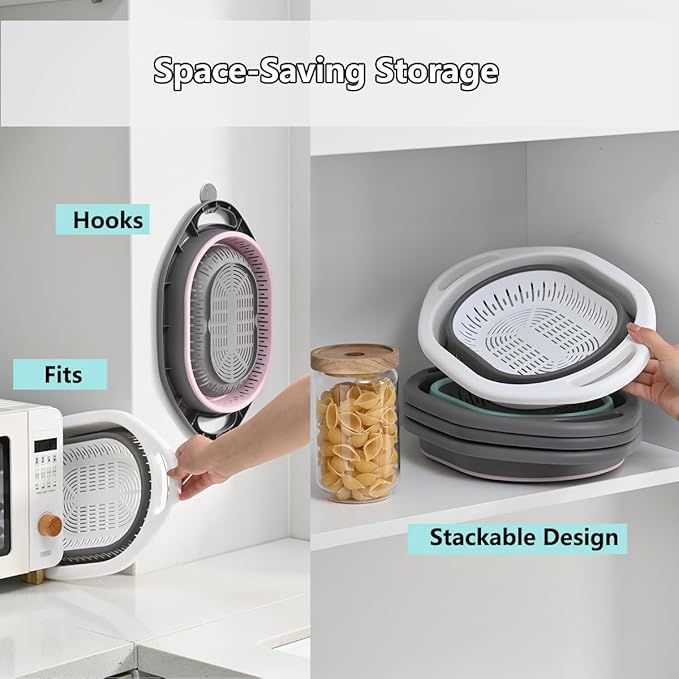 - Complete 2-Pack with Ideal Sizing: This practical set includes two collapsible strainers in modern pink and green. Each unit provides a generous 4L capacity with perfectly proportioned dimensions of 14" x 9.2" x 4.9" (unfolded), offering ample space for washing vegetables or draining pasta while remaining compact enough for easy storage when folded.