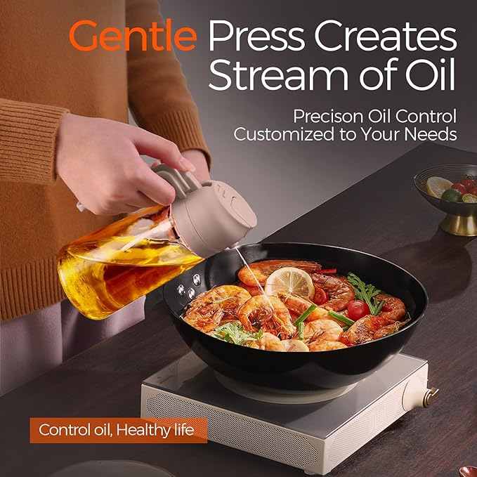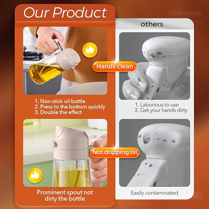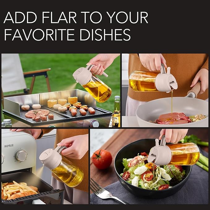 - Dual-Function Design & Multi-Purpose: Oil spray bottle for cooking offers the convenience of both spraying and pouring oil, suitable for a wide range of food preparation processes such as salad dressing, griddle, roasting, grilling, make your kitchen efficient and organized