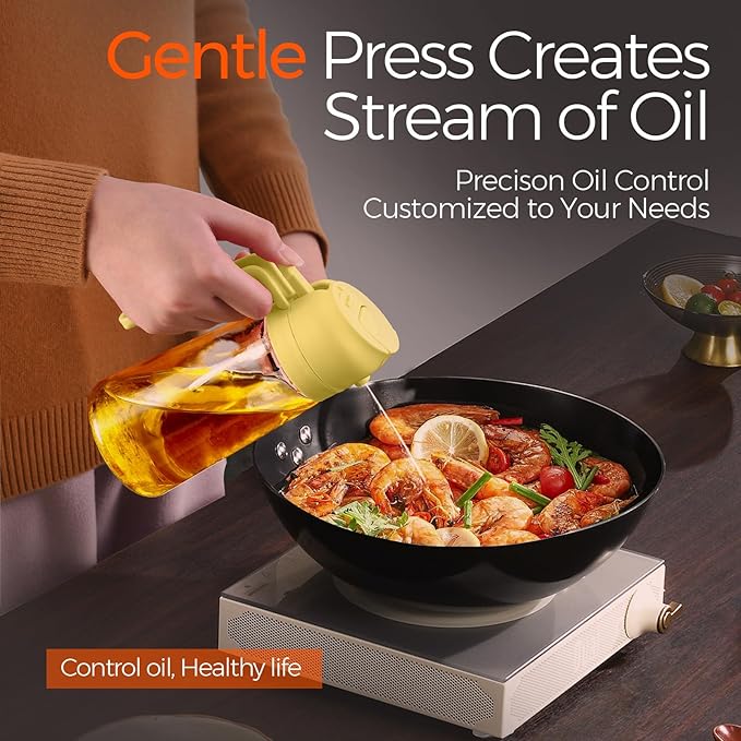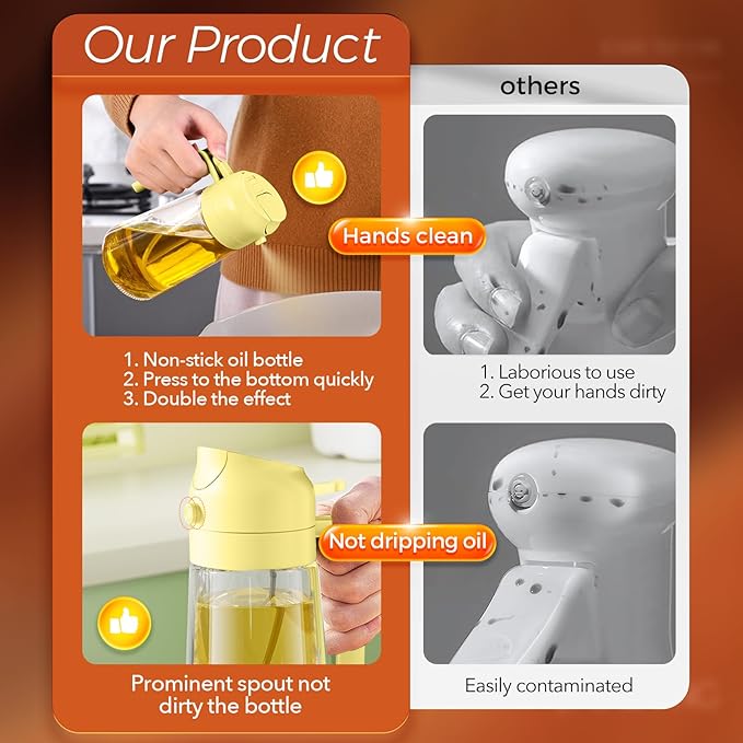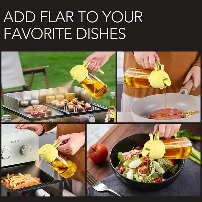 - Dual-Function Design & Multi-Purpose: Oil spray bottle for cooking offers the convenience of both spraying and pouring oil, suitable for a wide range of food preparation processes such as salad dressing, griddle, roasting, grilling, make your kitchen efficient and organized