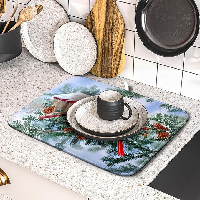 - 3【Unique Design】: Winter dish mat with vibrant bird and cabin patterns, which can add more xmas spirit to your kitchen office or coffee bar counter. The drying mat for kitchen counter with unique hanging rope design that can be hung without occupying any space,soft and foldable, easy to store.