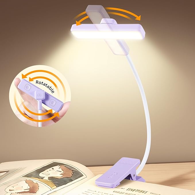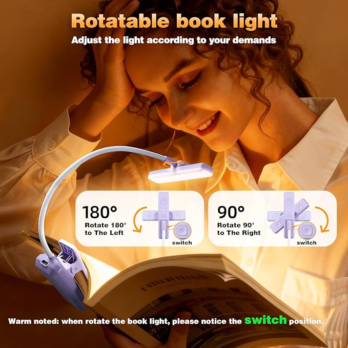 - 【24 Leds & 9 Color Temperature】This new pretty rechargeable book light with rotatable light head is perfect for everyone which can increase their reading enthusiasm. Meantime, parents will also love the book lights when working, reading or accompany their kids. The reading light is equipped with 24 upgraded smd leds, 9 different color temperature modes: cool white(6000k/6500k/7000k), amber light(1400k/1600k/1800k) and amber light + cool white(2200k/2800k/3400k)