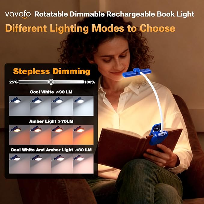 - 【Unmatched Directional Flexibility】This rechargeable book light with rotatable light head is VAVOFO’s new style reading light, it is perfect for everyone which can increase their reading enthusiasm. Meantime, The new design rotating head can offers ultimate flexibility to precisely angle the light beam onto your book, work surface, or project without repositioning the base.