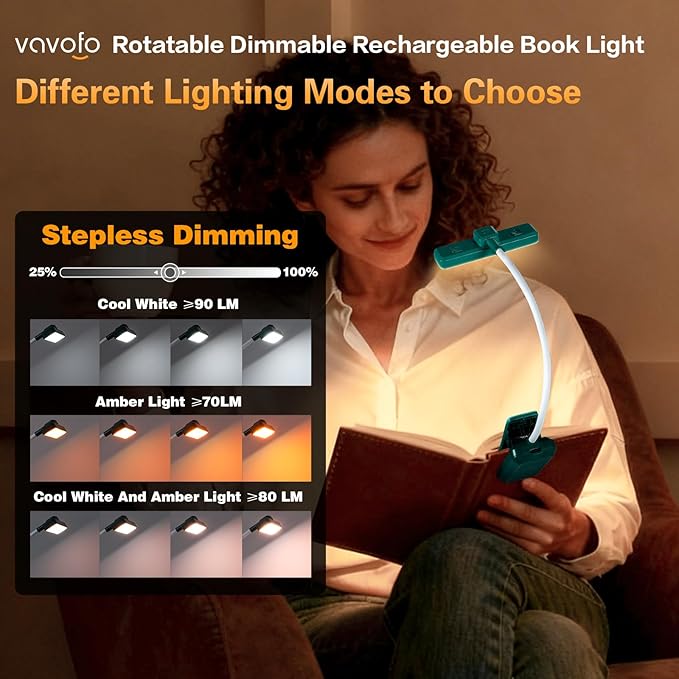 - 【Unmatched Directional Flexibility】This rechargeable book light with rotatable light head is VAVOFO’s new style reading light, it is perfect for everyone which can increase their reading enthusiasm. Meantime, The new design rotating head can offers ultimate flexibility to precisely angle the light beam onto your book, work surface, or project without repositioning the base.