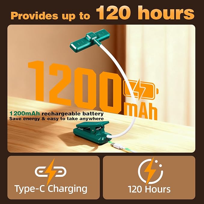 - 【Rechargeable & Long-lasting Lighting】Built-in 1200 mAh high-capacity rechargeable battery. Type-C port rechargeable with a built-in battery that can last up to 80 hours of use(Low Mode). At High Mode, the reading light can last up to 8 hours lighting time. No need to buy batteries any more, save money. The correctly charging book light will make your reading light more durable. Please charge the book light every 3 months. When book lights are not used for a long time, the reading lights should be fully charged before stored.