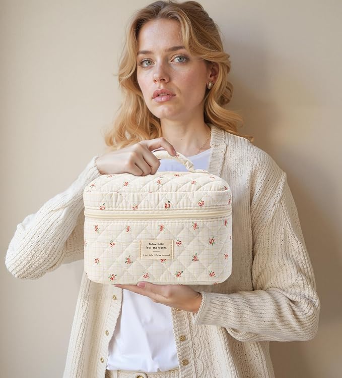 • HIGH-QUALITY MATERIAL - This quilted makeup bag is made of cotton material, which is easy to clean, and has been well-stitched and reinforced at all stress points. The double zipper is made of high-quality gold-plated alloy, which can make the makeup bag easier to pull and align neatly.