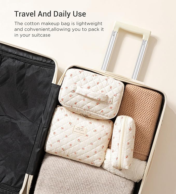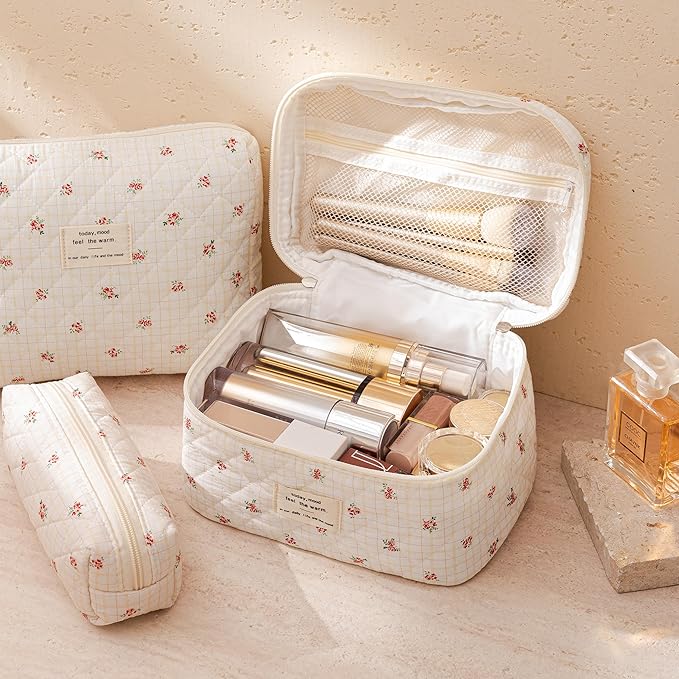 HBselect Quilted Makeup Bag, 3PCS Cotton Large Travel Makeup Bag, Cute Floral Coquette Make up Bag Cosmetic Bag Toiletry Bag for Women Girls