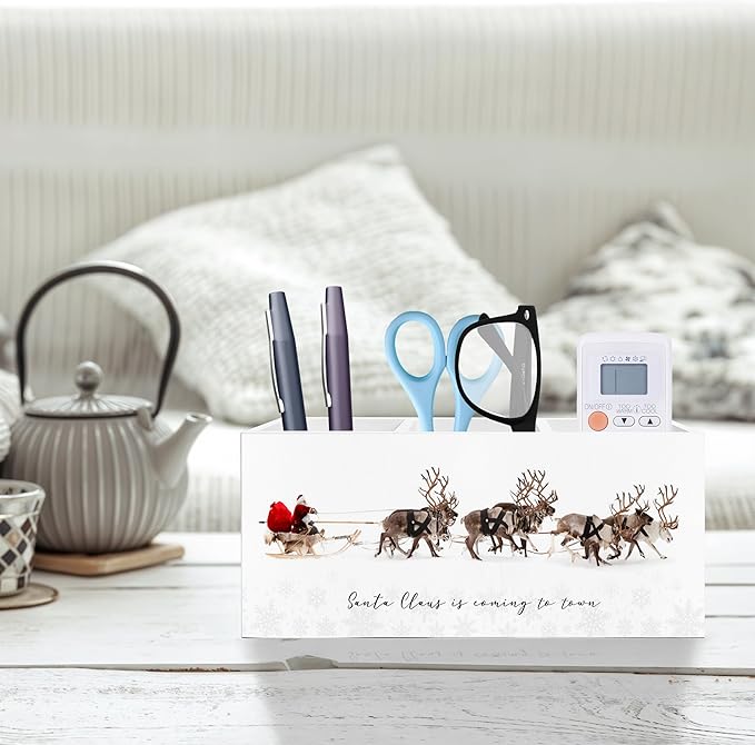 Winter Christmas Pen Pencil Holder for Desk, Christmas Office Decor, Rustic Farmhouse Xmas Santa Claus and Reindeer Wooden Box Block Sign for Home Office Desk Tabletop Decoration