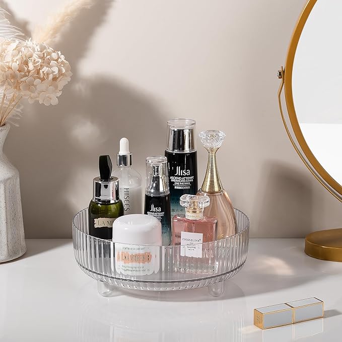 360 Rotating Makeup Organizer Perfume Tray Skincare Holder Spinning Cosmetic Storage Bathroom Countertop Organizer Lazy Susan Turntable for Dresser, Vanity, Kitchen, Small Clear
