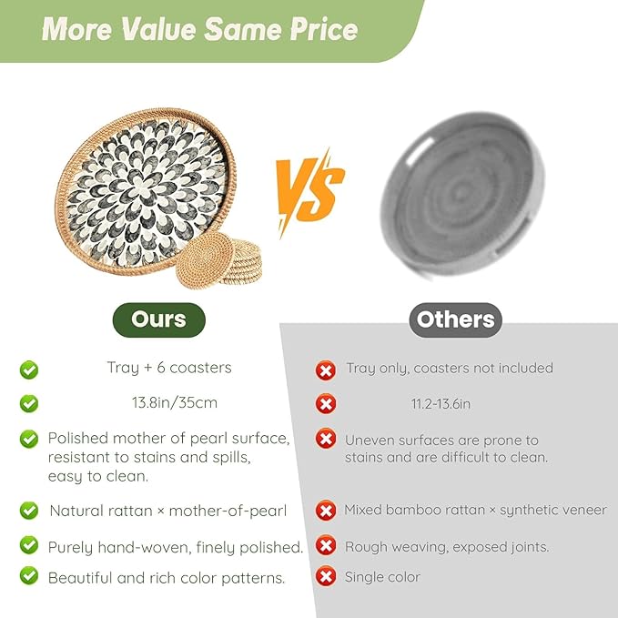 - [Premium & Elegan]t: Handcrafted from sustainable, high-quality rattan for enduring durability and organic charm. Features a exquisite Mother of Pearl inlay that adds a touch of sophisticated, shimmering beauty. Perfect for serving guests, organizing perfumes, displaying decor, or simply as a stunning standalone accent.