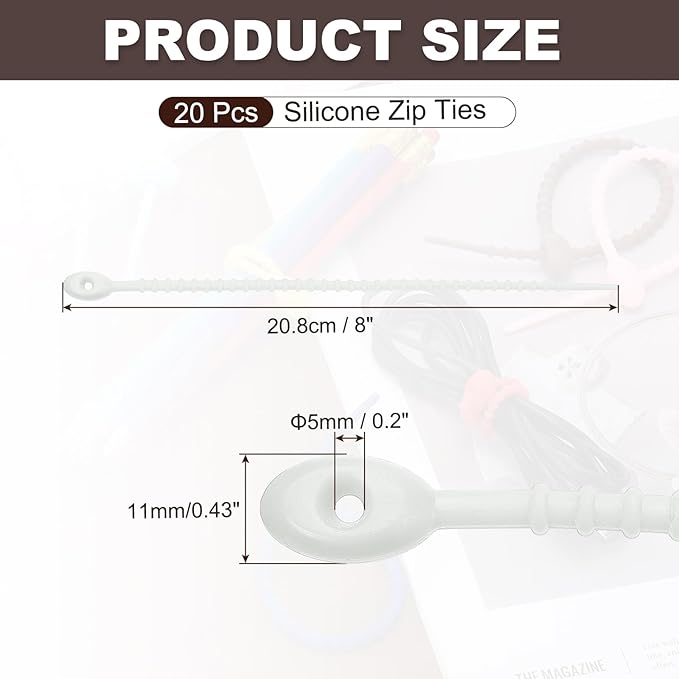 - Color: Grey, Material: Silicone, Length: 20.8 cm / 8 inch, Width: 11 mm / 0.43 inch, Wire Diameter: 5 mm / 0.2 inch, Packing List: 20 Pcs x Silicone Zip Ties