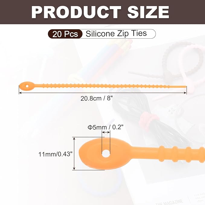 - Color: Yellow, Material: Silicone, Length: 20.8 cm / 8 inch, Width: 11 mm / 0.43 inch, Wire Diameter: 5 mm / 0.2 inch, Packing List: 20 Pcs x Silicone Zip Ties