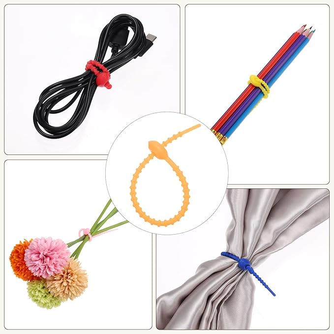 - Application: Silicone cable ties are suitable for sealing snack bags, organizing desks, drawers, tool boxes, trash bags, DIY keychain, bag charm, cord wrapping, kitchen storage, travel accessories, or any other indoor or outdoor use, which easily organize messy headphone cables, data cables, and other items.