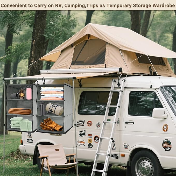 - [Versatile Hanging Shelves with Fodable Design & Maximize Storage Space] The dimensions of durable fabric hanging closet: 43.3" L x 12.2" W x 12.2" H / 110cm x 31cm x 31cm, provides ample room for a wide variety of items, but doesn’t take up much. And can be folded into a small piece .Works great to organize things for the limited space such as RV, closet. When not in use or during travel, simply fold it flat for compact storage in drawer/ Luggage box or under a bed. Its effortless setup requires no tools. ( ❤Please check carefully if the size is suitable!)
