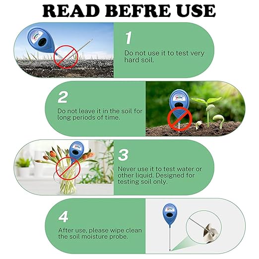 - 【Warm Tips】1.The soil moisture is specially designed for soil,please don't use it to test the water or other liquids 2.The garden moisture meter is not suitable for fluffy soil or soil with stones 3.After use,please take out the soil hydrometer and wipe the probe.