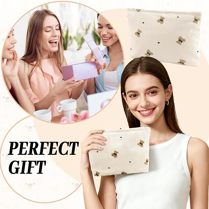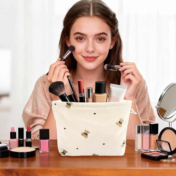 ZLFSQR Corduroy Makeup Bag for Women Small Corduroy Cosmetic Bag Large Cute Bear Travel Makeup Pouch for Purse White Cloth Cosmetic Pouch Zipper Storage Organizer Canvas Toiletry Bags