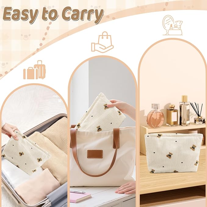 - MULTI-PURPOSE: The corduroy makeup bag can be used as a toiletry bag or storage bag. Daily makeup products, skin care samples, mobile phone can be put in the cute cosmetic bag, and can also be used as a purse. The cosmetic bag organizer makeup bag can be used while traveling, since the portable toiletry tote bags are lightweight and don't take up a lot of space in your suitcase. You get a small pouch in this set too, perfect for stashing in your backpack