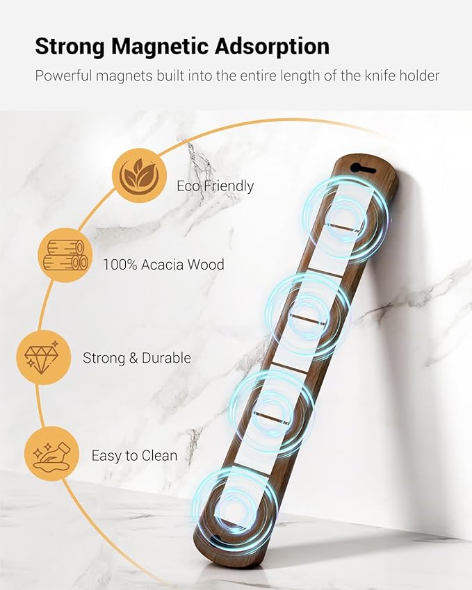 - DURABLE & SUSTAINABLE WOOD --- Crafted from 100% acacia wood, this knife strip is both durable and eco-friendly. It seamlessly blends with various kitchen decoration styles, adding a warm, lively touch to the kitchen. The smooth wooden surface is easy to clean—simply wipe it with a damp cloth daily.