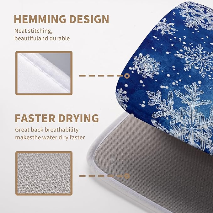 - [Kitchen Accessories]: The surface of the winter holiday drying dish pad for kitchen counter is printed with cute blue and white snowflake patterns. Unique design can create a strong winter and Christmas atmosphere for kitchen countertops and home environments; Cute winter dish mat will surprise your family and friends, making it the perfect holiday gift for them