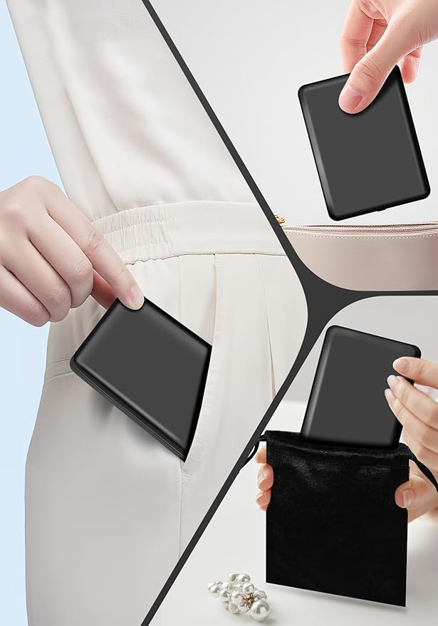 - Ultra-Portable & Travel-Friendly: Its compact design (2.68 IN L x 3.54 IN W) and lightweight build (only 3 oz) let it slide easily into your pocket, wallet, or purse. The included soft velvet pouch keeps the mirror safe from scratches, making it the perfect travel companion.