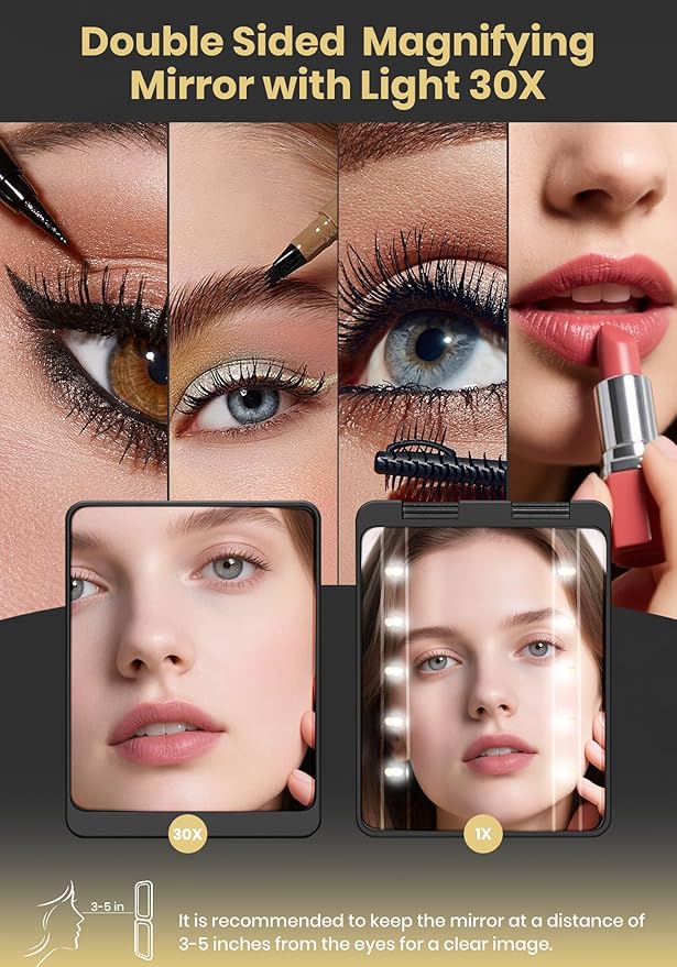 - Double-sided Magnifying Mirror: Featuring a 1X main mirror with built-in lighting and a 30X magnifying side, this compact mirror helps you spot every detail of your makeup under any condition. The 1X mirror is perfect for everyday touch-ups, while the 30X lens reveals fine imperfections—ideal for precise tasks like applying eyeliner, plucking ingrown hairs, or clearing blackheads