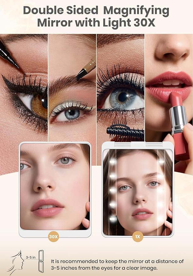 - Double-sided Magnifying Mirror: Featuring a 1X main mirror with built-in lighting and a 30X magnifying side, this compact mirror helps you spot every detail of your makeup under any condition. The 1X mirror is perfect for everyday touch-ups, while the 30X lens reveals fine imperfections—ideal for precise tasks like applying eyeliner, plucking ingrown hairs, or clearing blackheads