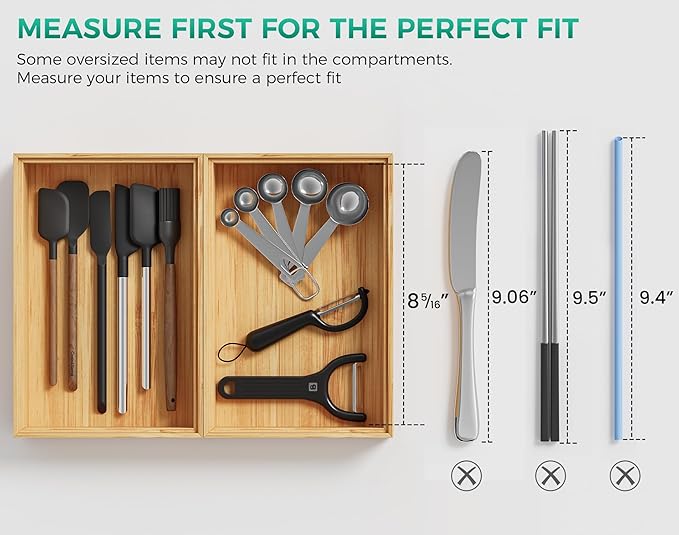 - PERFECT FIT FOR MOST DRAWERS - Engineered for a universal fit, this kitchen drawer organizer is ideal for narrow drawers. For the perfect fit, simply measure your drawer. This maximizes your drawer space efficiently and creates a clean, custom-built look