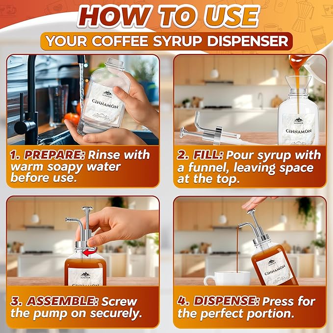 - Leak-Proof & Precise: Each 16.9oz coffee syrup bottles dispenses 2 ml per pump, giving precise control, reducing waste, & ensuring every drop is used. Keeps coffee syrup containers for coffee bar organized