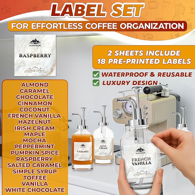- Flavor Organization: Includes 18 waterproof coffee syrup labels for Vanilla, Caramel, Hazelnut, Chocolate & more popular flavors. Easily organize syrup bottles for coffee bar and avoid mix-ups