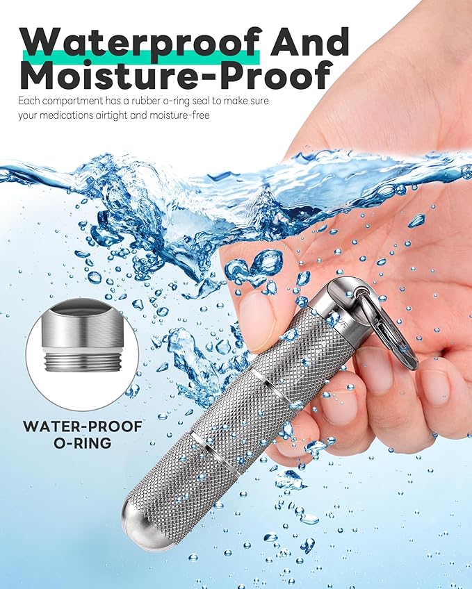 - Waterproof Pill Container: The small metal pill case has a rubber O-ring seal made it airtight and watertight enough to keeps your pills inside safe and dry when you are on vacation, trip, travel, camping or any outdoor activity.